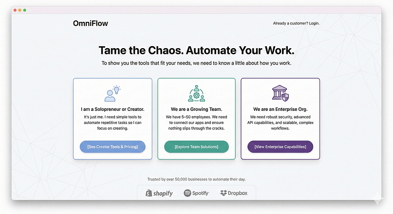 When a SaaS product serves multiple industries, one of the fastest ways to increase relevance is to let visitors choose their use-case before you show them anything else. Instead of guessing what matters to them, you let them self-identify in one click — agencies, coaches, ecommerce, B2B teams, whatever matches your world.