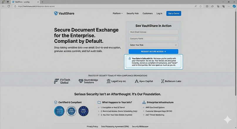 Any time I’m working with products that handle sensitive data — email platforms, fintech tools, health apps, anything with compliance requirements — the landing page has to earn trust before it earns a lead. People pause not because they don’t want the offer, but because they’re unsure what happens to their information once they click.