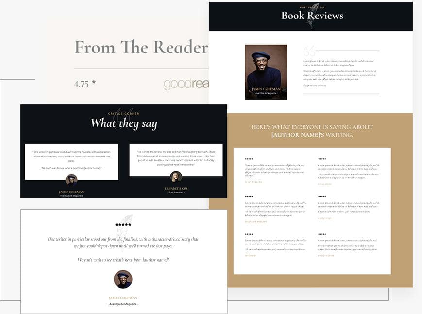 That's why Bookwise comes with a specially designed Reviews page template with space to show off your very best reader and critic reviews.