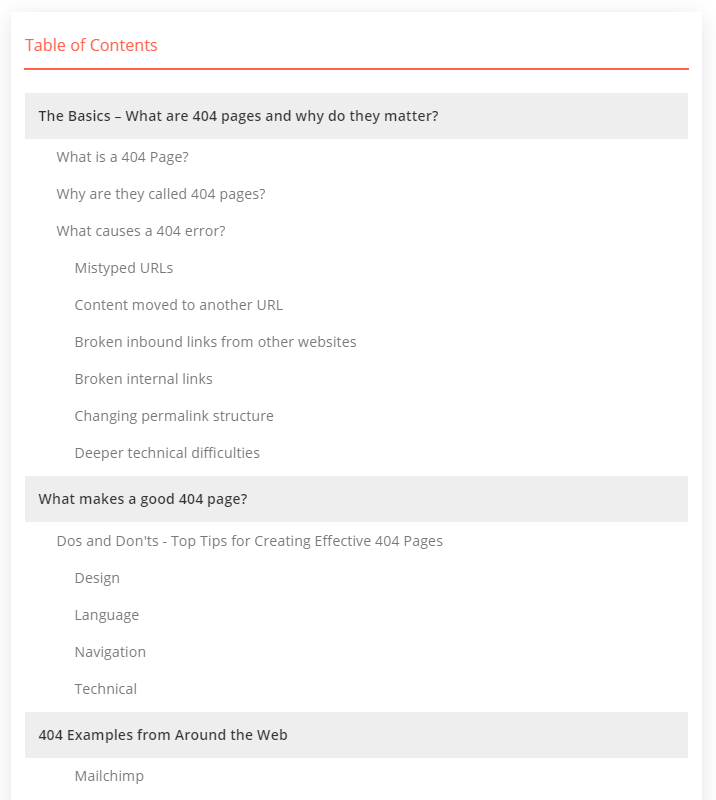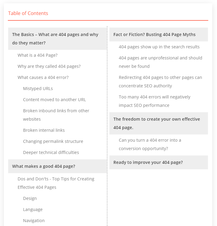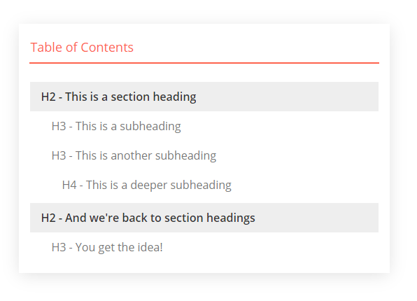 Table of Contents rely on structured sections or chapters, along with HTML headings like H2s and H3s. The article you’re reading right now is a perfect example.