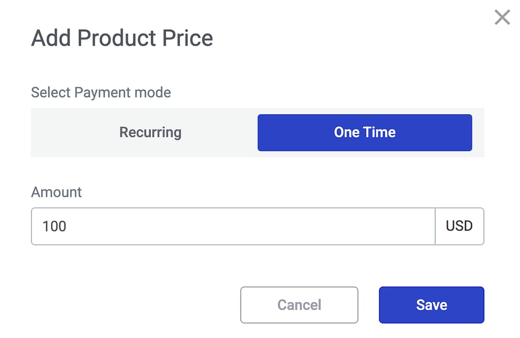 Clicking the button will open a popup where you can select to add the price under the recurring tab or one time.
