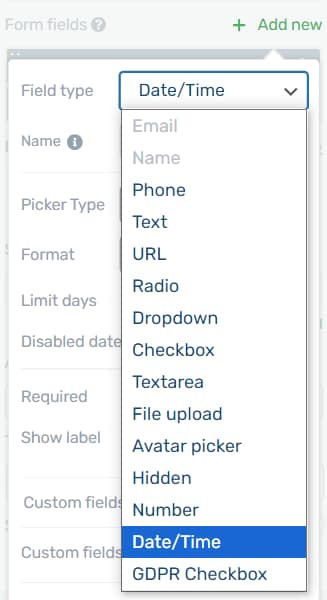 First, you can choose the “Picker Type” for your form field. Do you want your visitors to choose from a date range? Do you want the field to only show dates? Or just time?