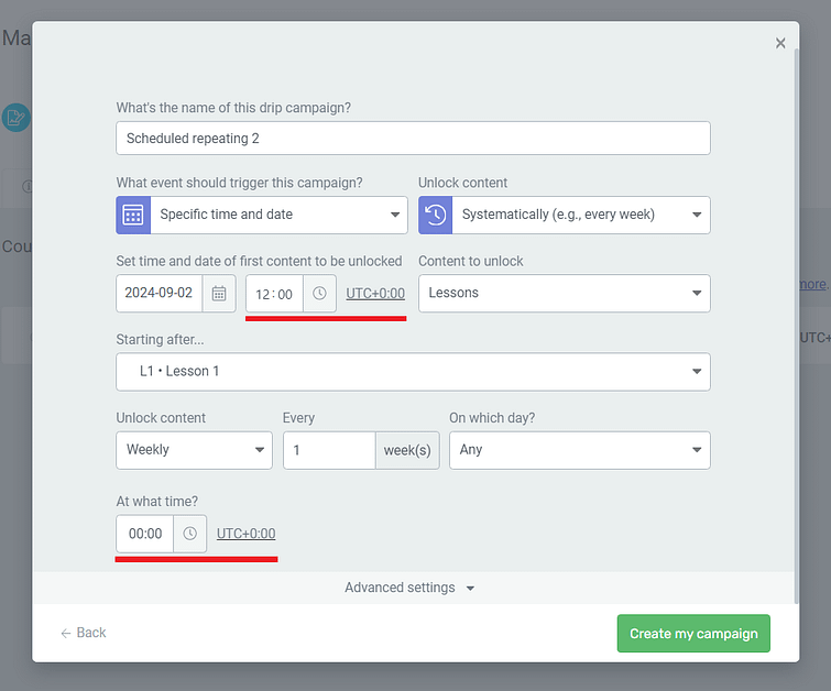 Previously, you could specify whether you wanted your lessons to unlock once a week, once a month, or on a given calendar day. But you couldn’t allocate a specific time of day – like 10am EST.