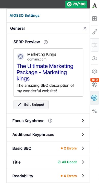 But what about the AIOSEO icon? Click that, and a whole SEO panel will open up.