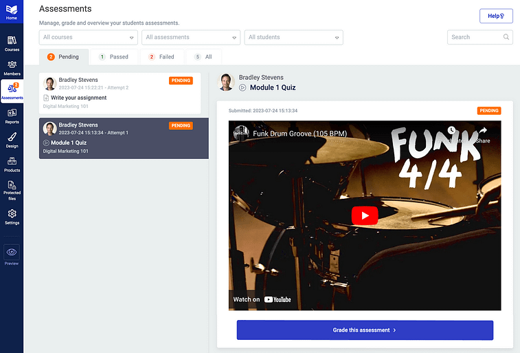 Yeah, the assessments feature which lets course creators view, grade and provide feedback to their students from an easy-to-use backend assessment inbox.