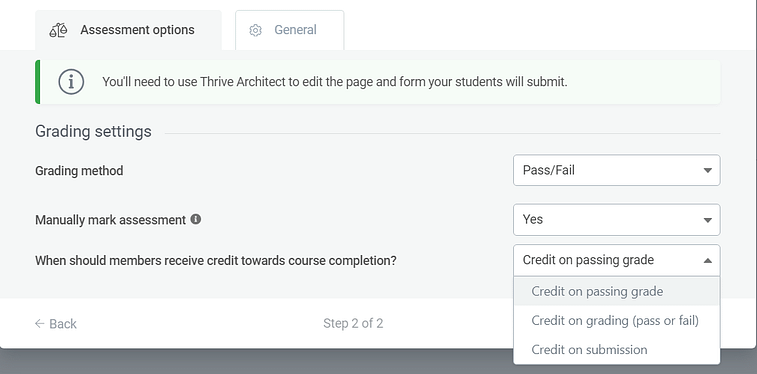 - 2Credit on grading (pass or fail)— once the assessment is graded either by the course administrator or automatically based on Thrive Quiz Builder settings.