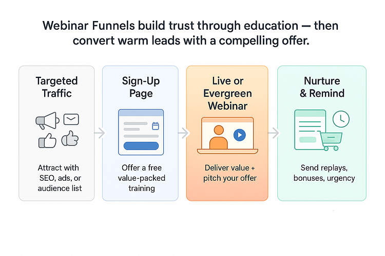 This funnel is designed to sell high-ticket or complex offers that require more education and trust. Visitors sign up for a live or evergreen webinar — usually 30 to 60 minutes long — where you walk them through the problem, share your framework or method, and then pitch your product or service at the end.