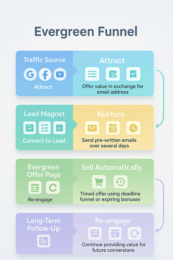 Lead magnet → Email nurture → Evergreen sales page → Deadline-driven offer → Post-sale automation