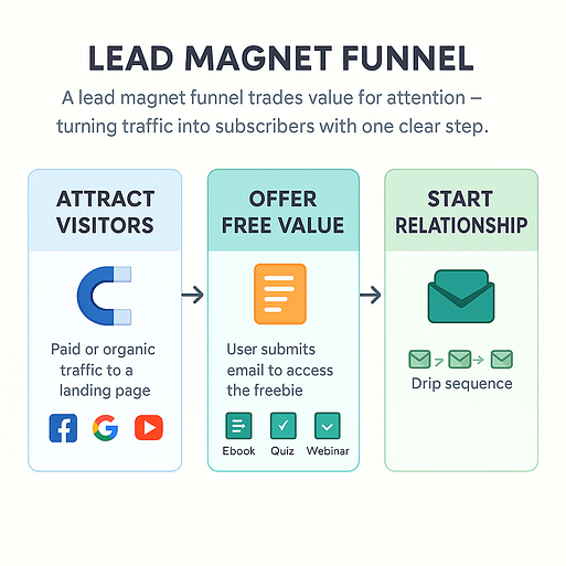This is the simplest and most essential funnel. It’s designed to grow your email list by offering something valuable in exchange for a contact. The lead magnet can be anything — a PDF, free training, quiz, swipe file — as long as it solves a real, narrow problem.
