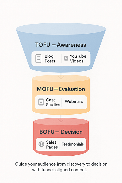 This is where people enter your world. They’re just becoming aware of a problem or exploring their options. At this stage, your goal is lead generation — not selling. Think blog posts, YouTube videos, social media, and SEO content. - MOFU (Middle of Funnel):