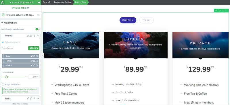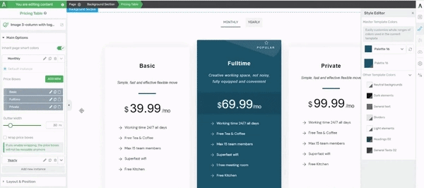 pricing tables, use the options in the left sidebar to change elements like your table’s background color, opacity, column options and more.
