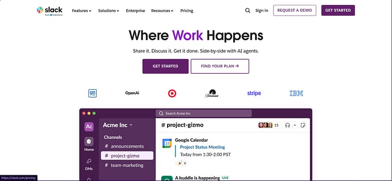 What’s Happening: Slack uses human-first illustrations, a conversational tone, and a focus on team connection rather than technical complexity. Their design breaks the mold of cold, corporate SaaS.