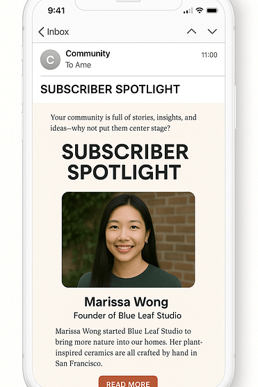 Your community is full of stories, insights, and ideas—why not put them center stage? A subscriber spotlight highlights one of your readers, their work, or their story. It doesn’t just engage that person—it makes *everyone* feel like they could be next.