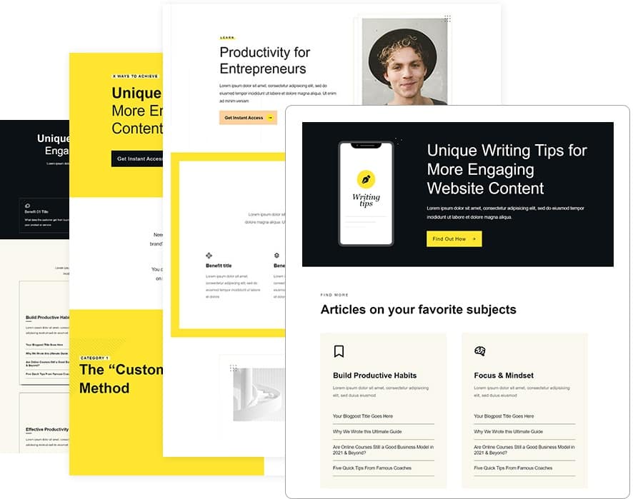 Ensuring that happens fast for every visitor is what Kwik Theme is all about. Our speediest Thrive Theme to date includes 12 conversion-focused homepage templates to choose from so you can get online and get selling more rapidly than ever before. Choose a template that fits your business needs best and customize it with a few clicks to fit your brand and personality.