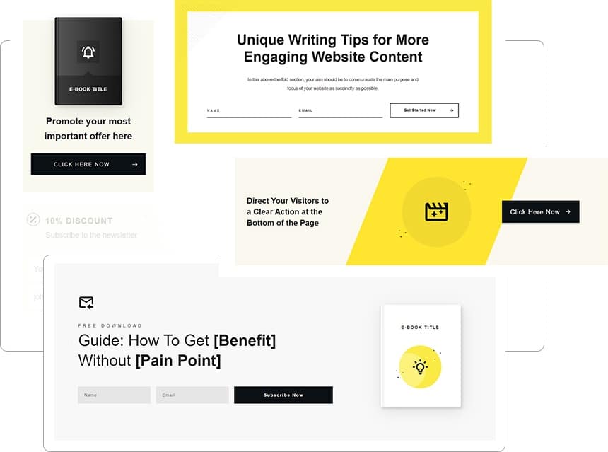 Prompt your visitors to take action with dozens of sleek call-to-action designs. Kwik gets your web traffic opting in, buying now, and signing up faster by putting conversion power in your capable hands. Find a form you like, dial it in to suit what you’re offering, drop it on the canvas and go! Turn visitors into leads – and leads into customers – with Thrive’s speediest, most lightweight theme to date.