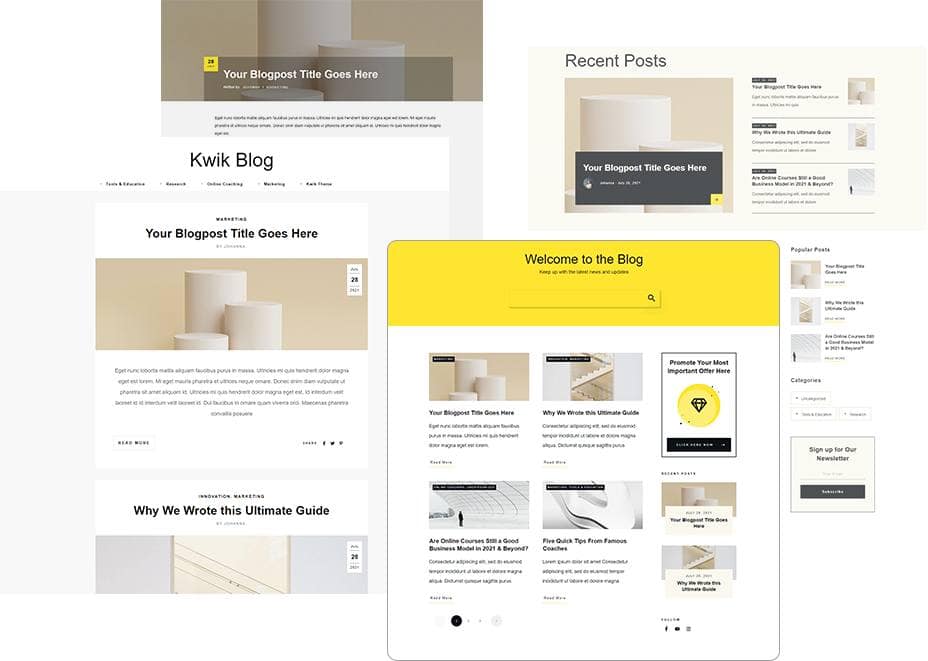 Kwik Theme comes with 11 jaw-dropping blog list design templates. Select from multiple list, grid or masonry layout options. Add feature images if you’d like (or don’t) and toggle on infinite scroll or pagination if that's how you [blog] roll. Design, customize and display a blog list page that will showcase your engaging content in the best light.