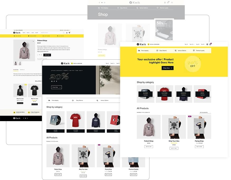 Kwik’s 14 WooCommerce ready templates allow you to do just that. Get selling ASAP with persuasive product, shop and checkout pages designed with quick deployment and conversions in mind. New to online commerce? Not a problem. Kwik’s ease of use levels the playing field for pros and newbies alike.