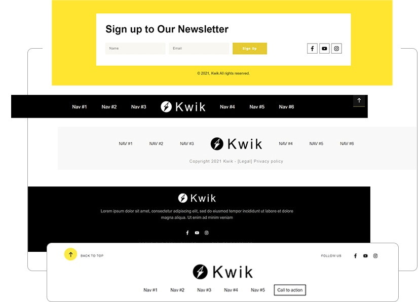 Discover the frustration free way of getting your site’s footer looking exactly the way you want it. With Thrive Theme Builder and Kwik, adding those polished finishing touches like your footers is easy. Just drag & drop the elements you need into your design. Forget about taming wonky widgets and select from 24 striking, professionally designed footer templates to launch your site fast.