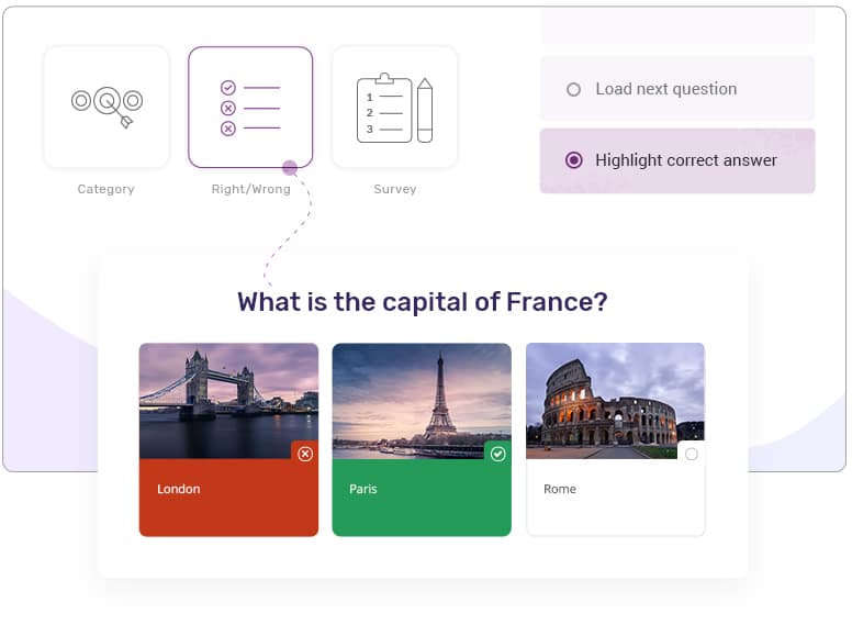 Show the student results based on score, percentage, category, right/wrong or conduct a survey.