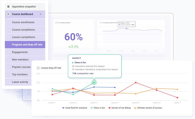 Discover critical information such as how many students have completed each of your course lessons, presented in a handy line chart. Find out which of your lessons are being skipped, and which ones are most helpful to your students.