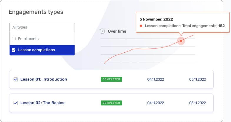 Track when students have enrolled in a course, completed a lesson, or left a comment. Watch your engagement numbers climb as more and more students enroll.