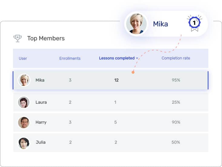 Want to know who is truly excelling with your courses? View a list of your top students, and sort by number of courses enrolled, number of lessons completed, and completion rate.