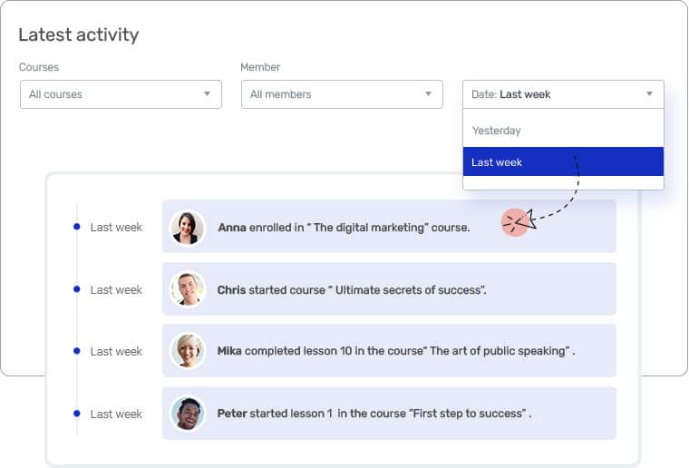 Keep tabs on the action by viewing the activity feed inside Thrive Apprentice Reports. Filter by course and/or a custom time frame.